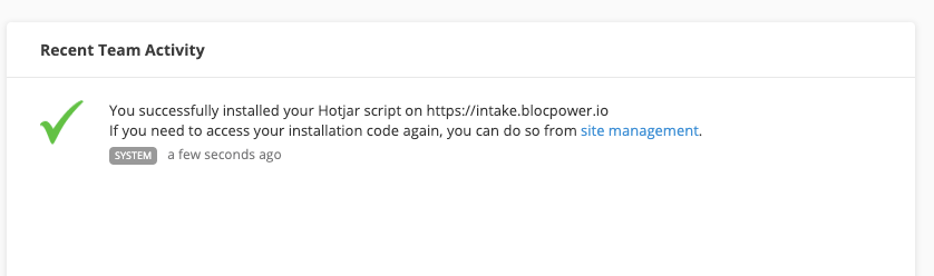 - Visit Hotjar site dashboard you should see recent team activity in the right indicating a successful install